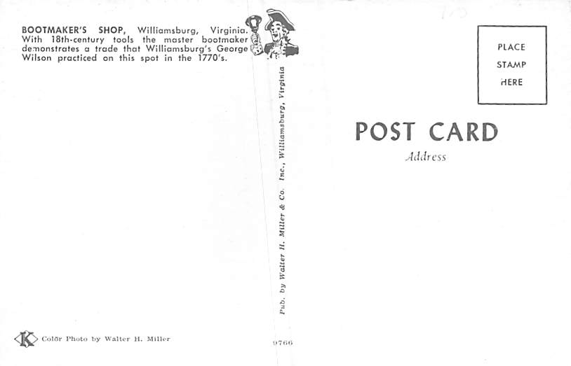 Bootmaker's Shop Williamsburg, VA, USA Postcard Postal Date: {{Product Field 4 ( Postal Used, Unused)}} Grade: 2 Size: Regular Size Postcard - approximately 3 1/2 inch x 5 1/2 inch (9 CM x 14 CM) Grading Scale ... Read More