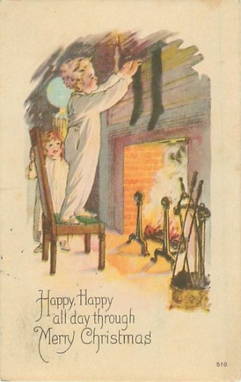 DESCRIPTION: Little boy in pajamas hanging stockings on the fireplace while a little girl watches. Postmarked 1923Publisher: ? Bird at an inkwell logo.