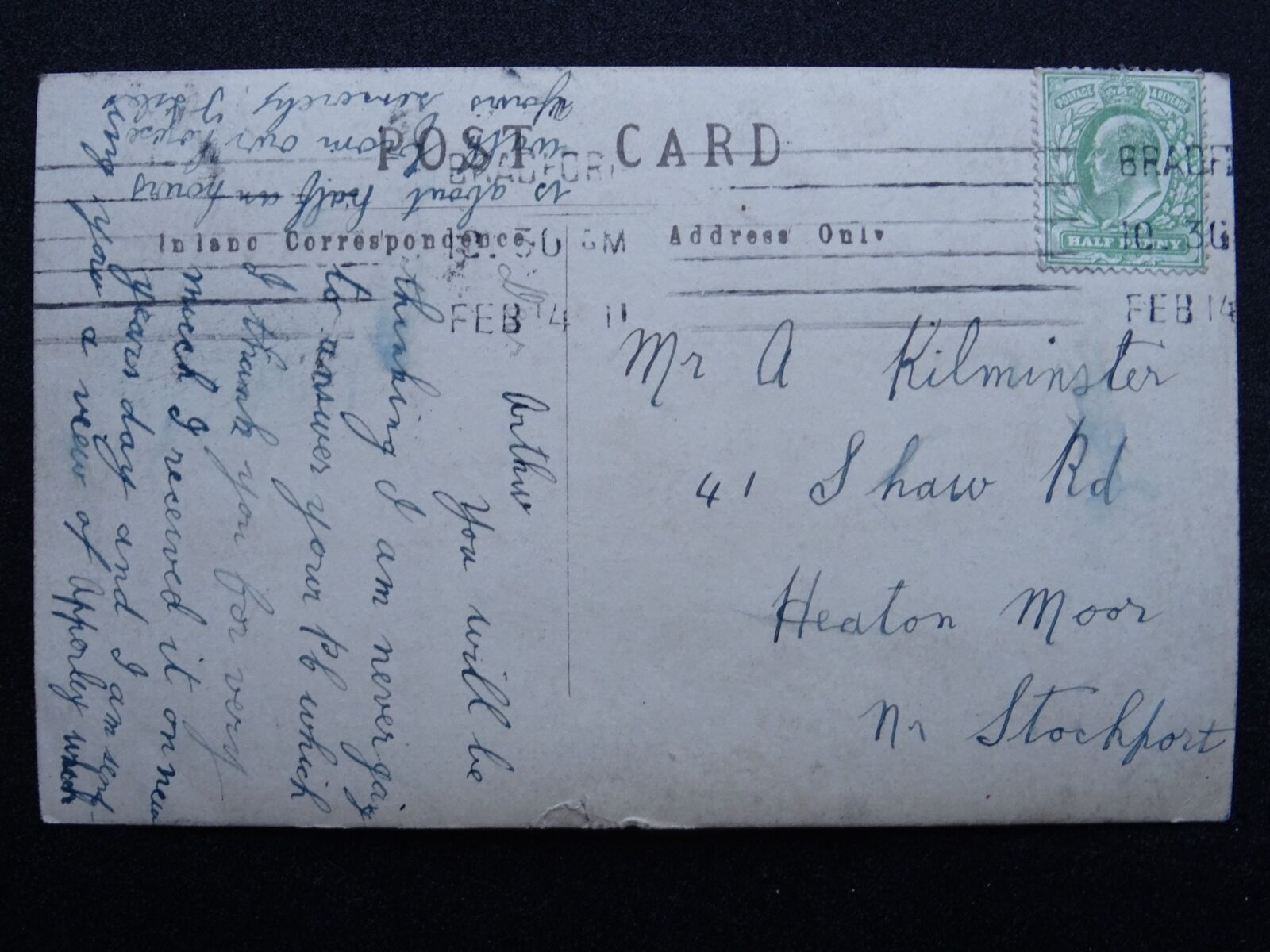 Bradford - Apperley Bridge BRADFORD Apperley Lane c1911 RP Postcard Bradford - Apperley Bridge BRADFORD Apperley Lane c1911 RP Postcard Postcard Details Additional Information - Postcard Condition (G) Good / vertical printers mark / corner & edge knocks Postally - used / Postcard Details - Please see detail on the photographic image or contact us for details. Abbreviations: (UB) Undivided Back / (RP) Real Photograph Postcard / (PM) Postmark Interest / (CDS) Cancellation Date Stamp / (SQC) Squared Circle / (DP) Duplex PostmarkPTP Reference - 181222 Postcards WelcomeWelcome to our store. At Past Time Postcards we stock a comprehensive range of British antique and vintage topographical postcards, cigarette cards, rare antique prints and other antique collectables.We aim to make your shopping experience enjoyable and stress free. We list our postcards topographically and by subject matter to make it easier for you to locate the items that interest you. Feel free to browse and explore at your leisure, however if you require assistance locating items or have a specific request please don't hesitate to contact us.Combined Postage We will always combine postage when you purchase multiple items. Please make your multiple purchases by using your Hip BASKET where postage will be combined automatically.Postage & PackagingPostage rates are calculated to include postage and packaging. All Full Sets of Cigarette or Trade Cards are posted 1st Class and protected with a plastic sleeves in a BOARD BACKED ENVELOPE & FULL SET HAVE ADDED STIFFNER BOARD for added security and protection. Payment MethodsOur preferred method of payment is through PayPal for all purchases.UK CUSTOMERS can make payment by PayPal, Personal Cheque or Postal Order. PLEASE NOTE: Credit cards included in PayPal payment method Inc. Visa, MasterCard, American Express, Discover. FOR CUSTOMERS OUTSIDE THE UK: we can only accept PayPal as method of payment100% SatisfactionIf in the unlikely event you are unhappy with your item you have purchased on the basis that the postcard was incorrectly described or graded we do offer a complete refund less the cost of postage and packaging once the item is returned to us.Condition & Grading Information(M) Mint – Like new, almost perfect(EX) Excellent – No obvious flaws, sharp corners, clean and if postally used the writing does not detract from appearance.(VG) Very Good - Minor defects such as album marks, signs of age and handling is acceptable that do not detract from appearance.(G) Good – Noticeable defects, handling and wear apparent. Minor creasing or minor postal damage not detrimental to image.(F) Fair – Obvious creasing, staining, small tears or damp damage evident. Significant edge or corner damage.(P) Poor – Incomplete or image seriously affectedFinally if you have any specific requests or questions we are always very pleased to offer support and assist you with your collecting needs.Kind regardsMark - Past Time Postcards Listing and template services provided by inkFrog