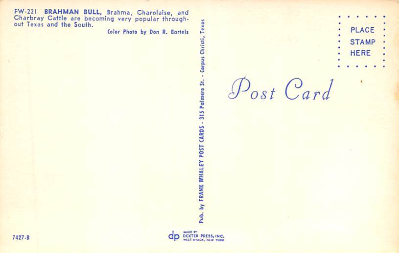 Brahman Bull Postal Date: View Images Grade: 1 Size: Regular Size Postcard - approximately 3 1/2 inch x 5 1/2 inch (9 CM x 14 CM) Grading Scale: Grade 1 = Perfect corners Grade 2 = Very Minimal corner wear, no ... Read More