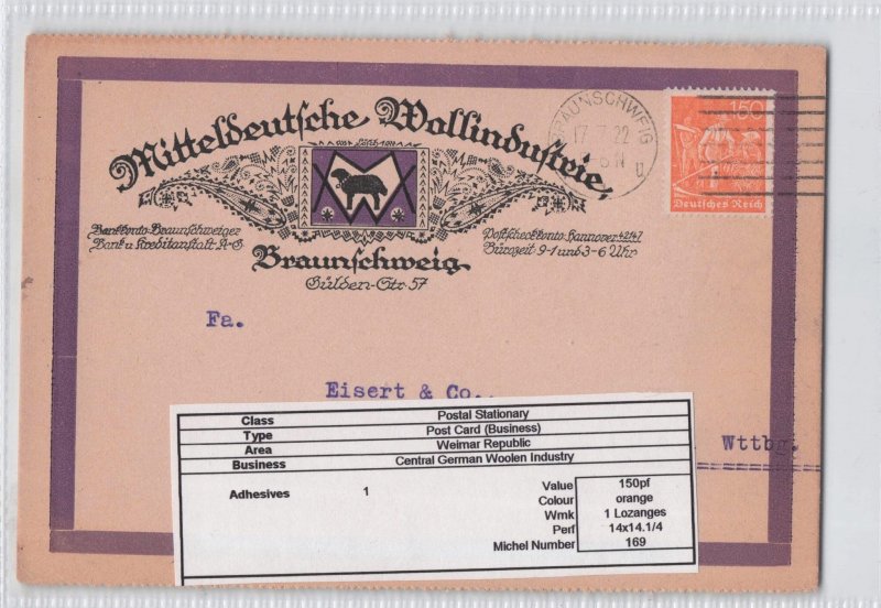 ZX883 This has come from an amazing early postcard collection where the collectors interest was local Geman stationary, commemorative franks, postmarks, historic and often very unusual businesses, company logos, strange messages on reverses, rare postmarks, unique franks, scarce cancellations and much more. Each postcard has been placed in a plastic sleeve which easily slides off and inside the owner has added small long sheet of typed paper with detailed analysis of the souvenir (please enlarge and read as it is laid loose in front inside the wallet). Please contact me for any additional images as the reverse is also very collectible as it has the message from the company and I have scanned too. It is excellent condition.