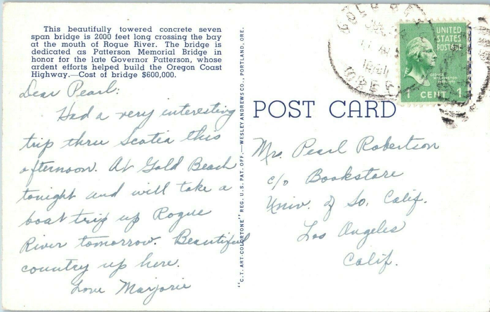 Bridges Postcard Patterson Bridge over Rogue River Oregon Posted 1944
