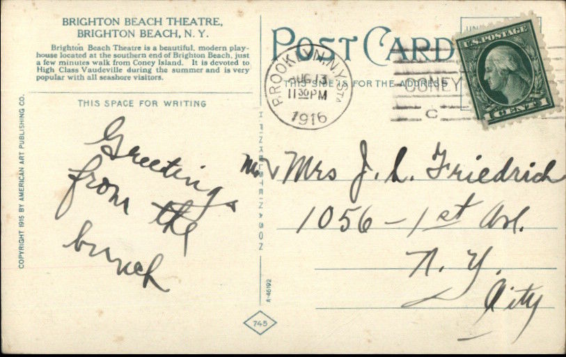 Brighton Beach Brooklyn NY Theatre c1915 Postcard