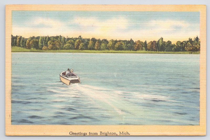 Brighton Michigan~Speed Boat on Lake~Linen Postcard