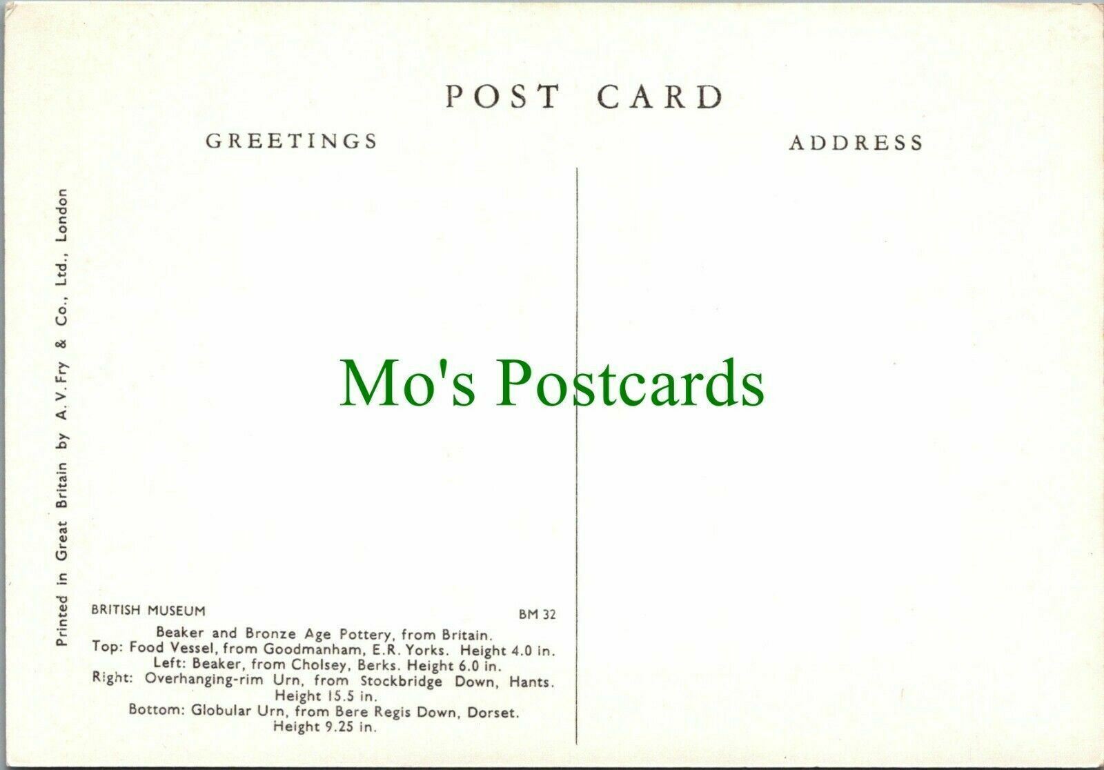 This is a british museum postcard - beaker & bronze age pottery from britain Publisher: A.V.FRY & CO Postcard Size: CONTINENTAL.If a postcard has any obvious defects they will be mentioned within this produ ... Read More