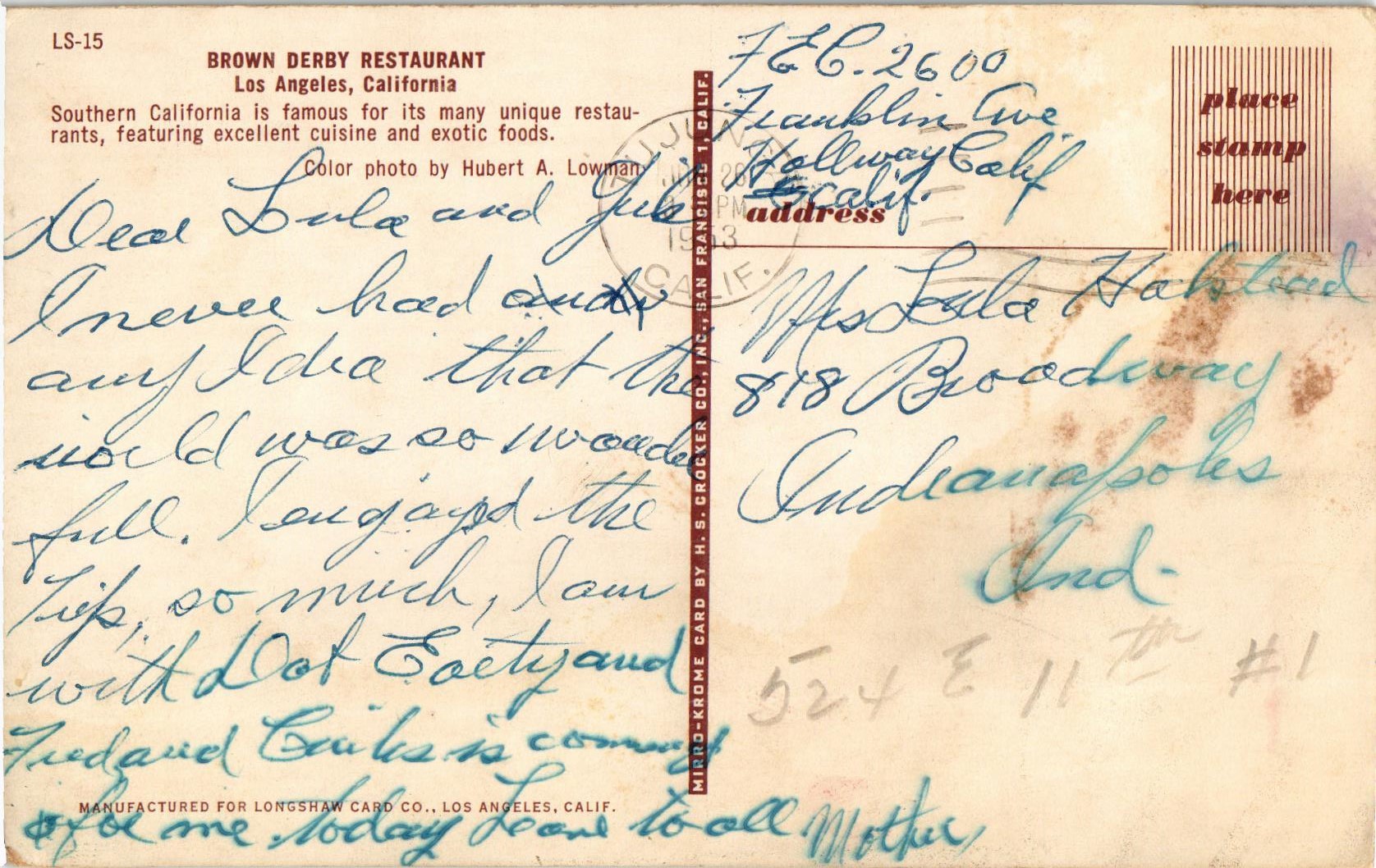 BROWN DERBY RESTAURANT LOS ANGELES CALIFORNIA