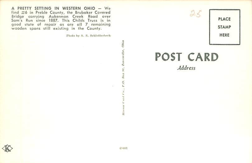 Brubaker Covered Bridge Preble County, Ohio OH Postcard - View back of card