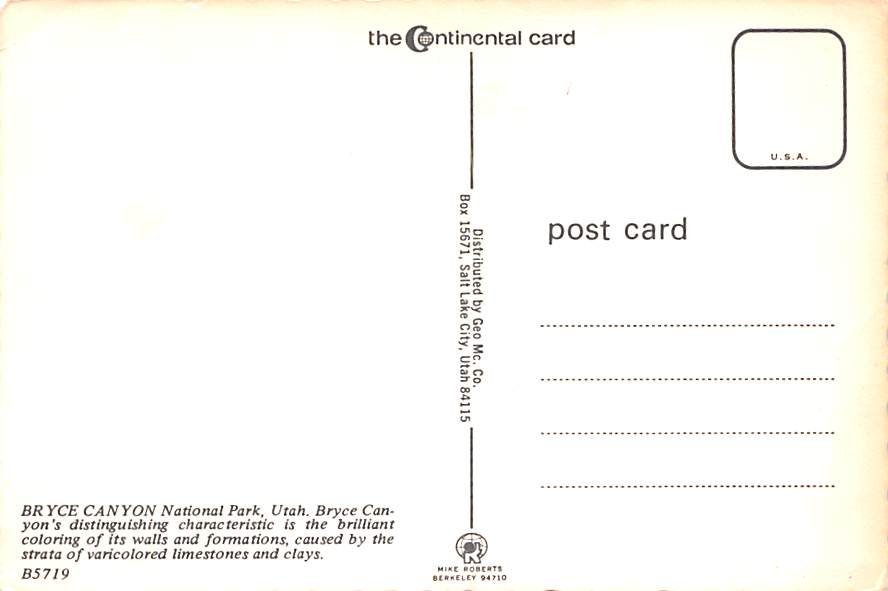 Bryce Canyon National Park - Utah Grade: 1 Category: Continental Size Postcard, Approx 4 in x 6 in (10 cm x 15.25 cm) Product Size: Continental size: 4X6 inches (10.5 cm x 15 cm) Grading Scale: Grade 1 = Perfe ... Read More
