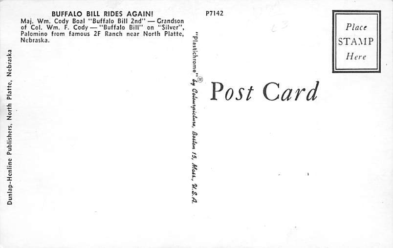 Buffalo Bill Rides Again Buffalo Bill Postcard Unused, Grade: 2 - card does not lay flat, , Size: Regular Size Postcard - approximately 3 1/2 inch x 5 1/2 inch (9 CM x 14 CM) Grading Scale: Grade 1 = Perfect co ... Read More