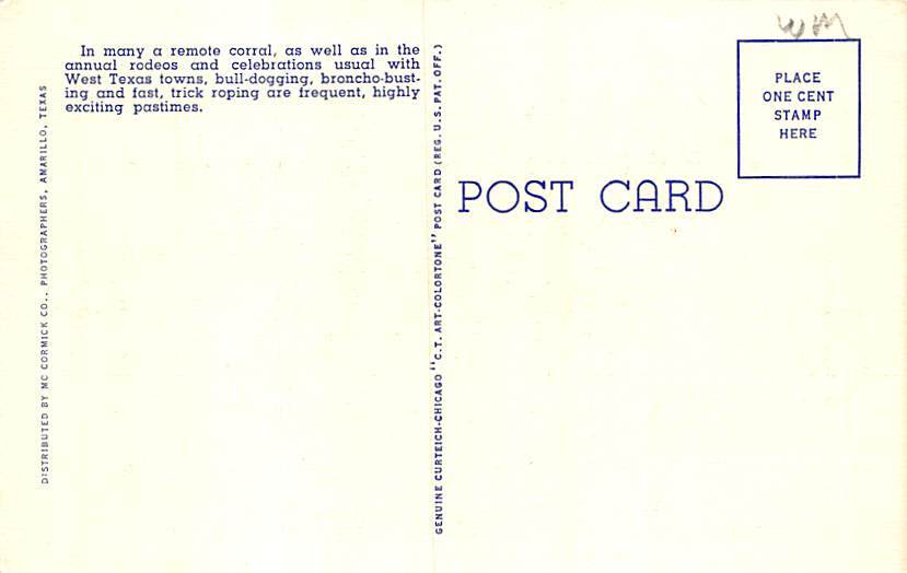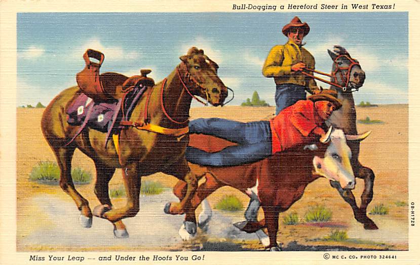 Bull Dogging West, Texas USA Postcard View Images, Grade: 1, , Size: Regular Size Postcard - approximately 3 1/2 inch x 5 1/2 inch (9 CM x 14 CM) Grading Scale: Grade 1 = Perfect corners Grade 2 = Very Minimal ... Read More