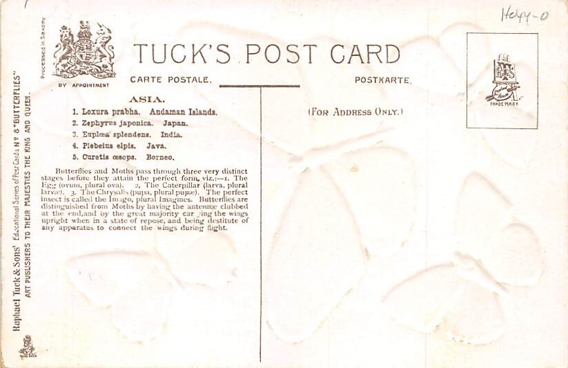 Butterfly Postcard , Grade: 2 Size: Regular Size Postcard - approximately 3 1/2 inch x 5 1/2 inch (9 CM x 14 CM) Grading Scale: Grade 1 = Perfect corners Grade 2 = Very Minimal corner wear, no creases Grade 3 = ... Read More