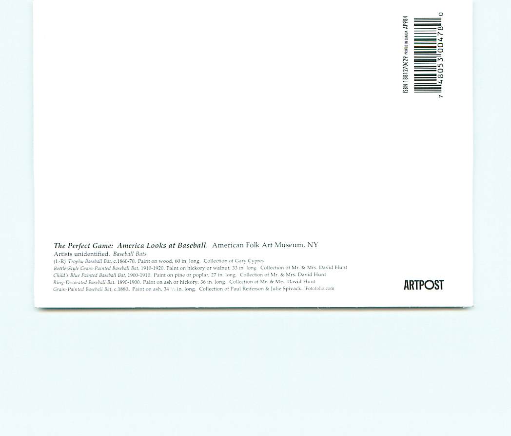 Buy Postcard Baseball Bats Postcard of the perfect game of baseball, american folk museum in new york, the gladstone collection of baseball art made by artpost Country: Germany Era: Chrome Publisher: None Size ... Read More