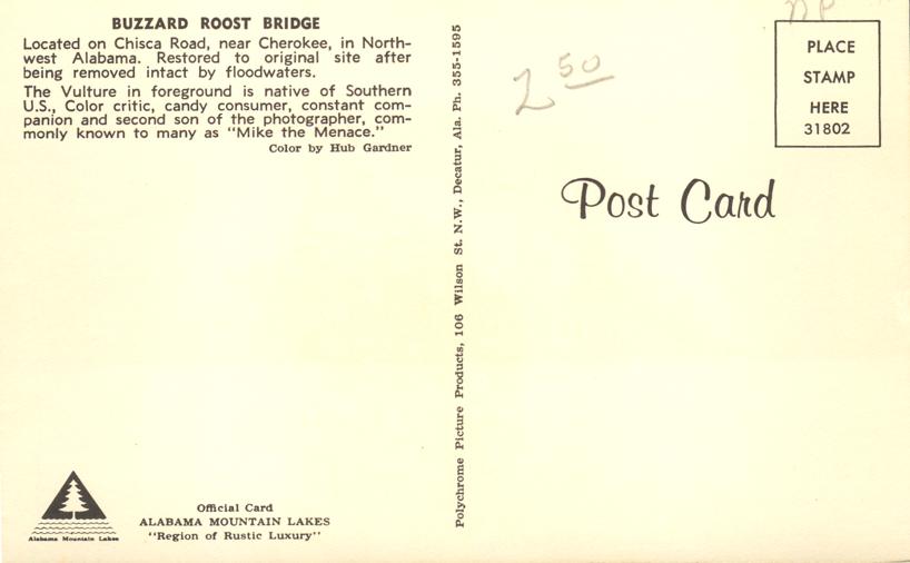 Buzzard Roost Covered Bridge. near Cherokee, Alabama. Boy in foreground known as "Mike the Menace". Standard sized chrome card. Excellent condition.