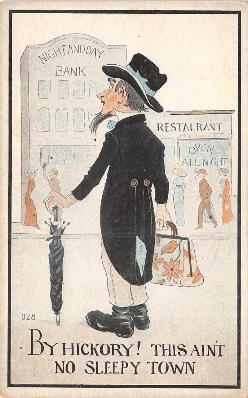 BY HICKORY THIS AIN'T NO SLEEPY TOWN BANK RESTAURANT COMIC POSTCARD (c.1910)