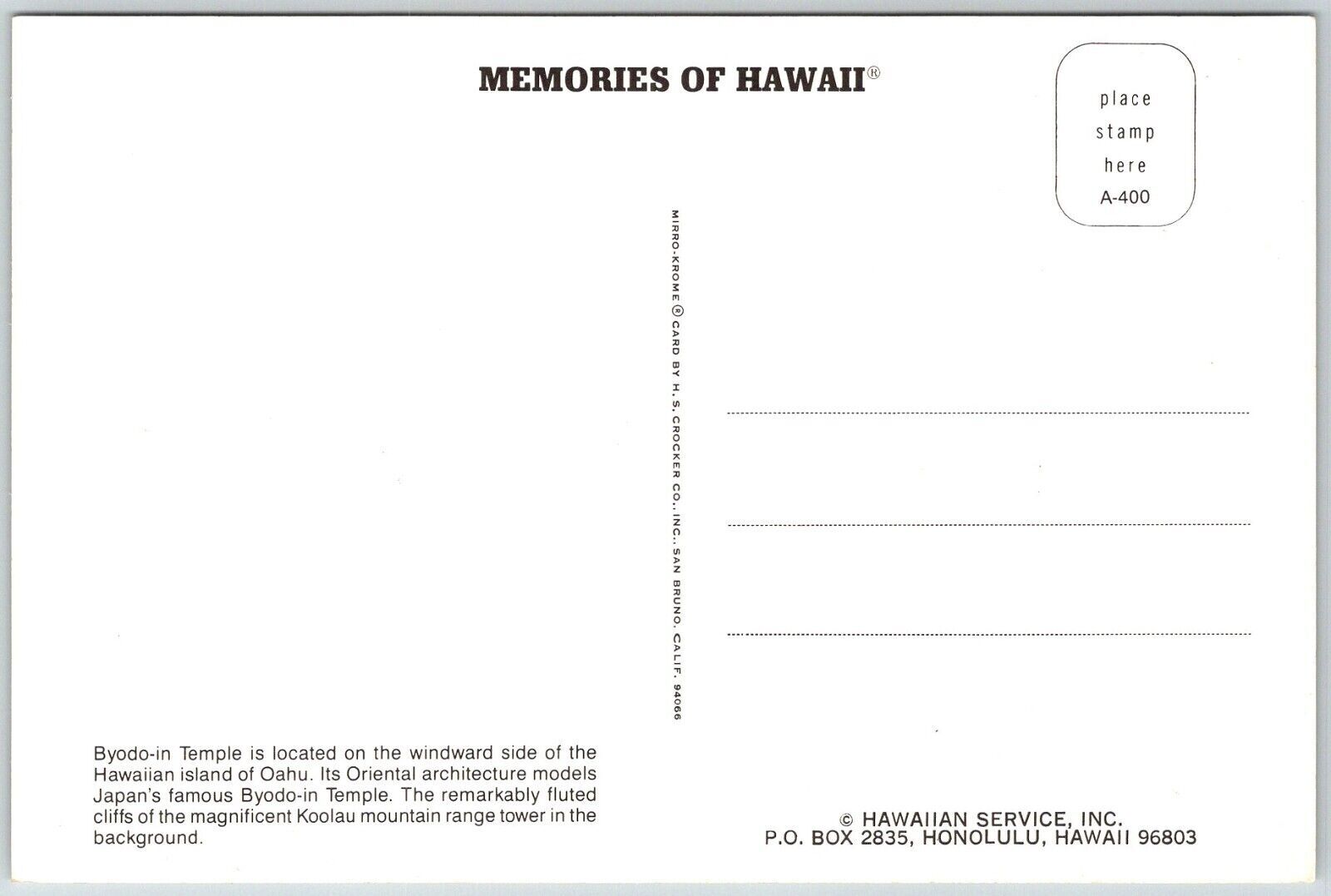 Byodo-in Temple Oahu Hawaii Continental Postcard