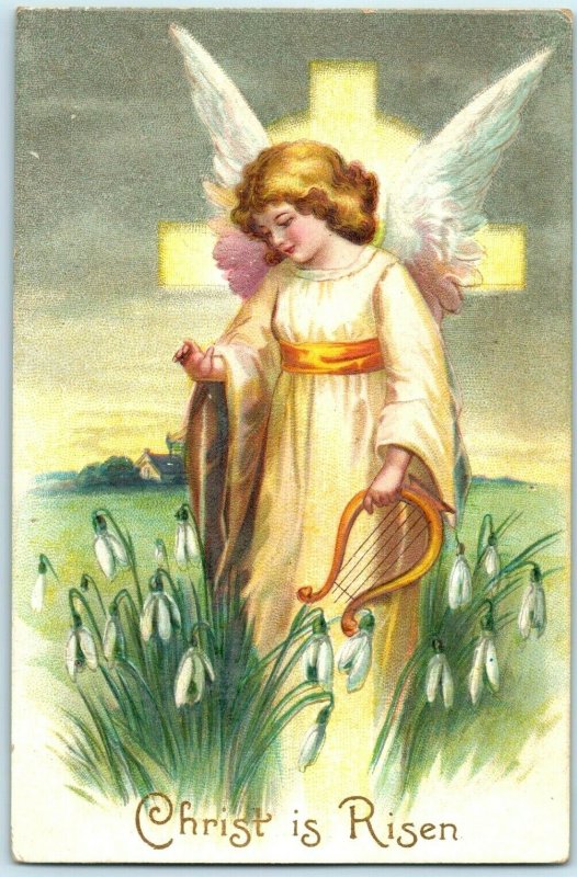 C. 1910 Christ Is Risen Lovely Angel Harp Easter Postcard P66