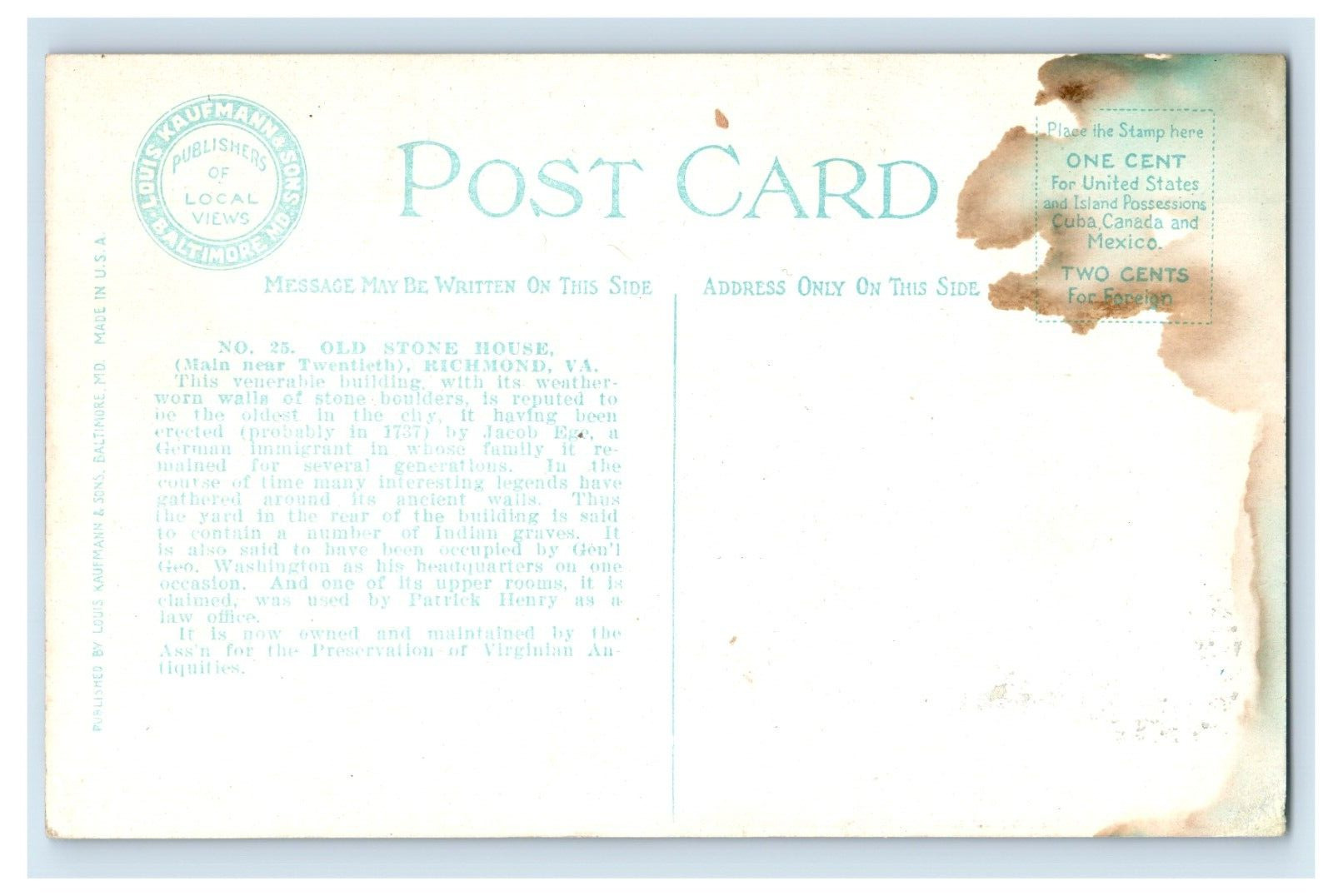 C. 1910 Old Stone House Richmond VA. Postcard P191E