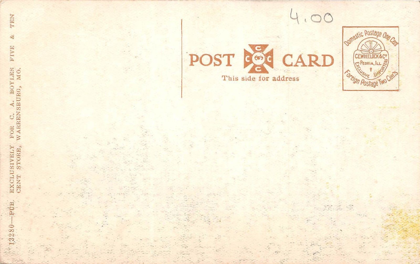 Neat old post card. vg condition.Feel free to ask any questions. Please bid early on auction items, I tend to raise prices when I move items to my store. Thanks. If you purchase multiple items, please combine them (adding store items to cart) and use Paypal only once to receive discount. Thanks. Check my EXCELLENT feedbackI ship postcards quickly and between folders. < Track Page Views WithAuctiva's FREE Counterfunction $af(d,a,e,l,g,h,k,b,f,c){c=$af;if(a&&!c[a])(c[a+="$"]||(c[a]=[])).push(d);else{e=document;l=e.getElementById("af"+d);g=e.getElementById("afph"+d);h=e.createDocumentFragment();k=l.childNodes;b=0;for(f=k.length;b
