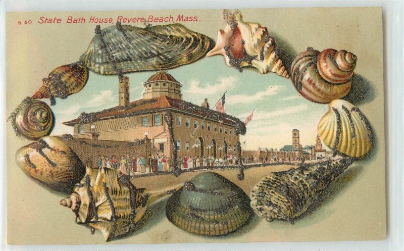 c1907 Embossed Shell Border Postcard S-50 Bath House, Revere Beach MA, Glitter