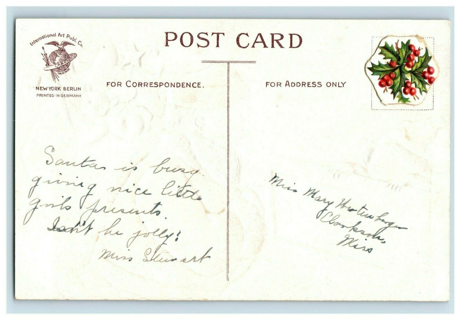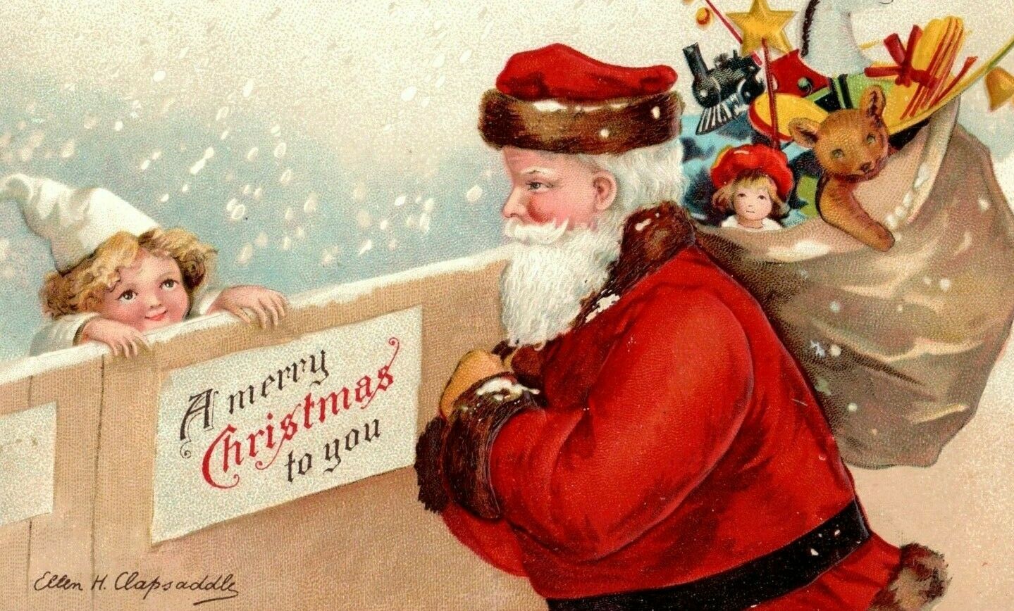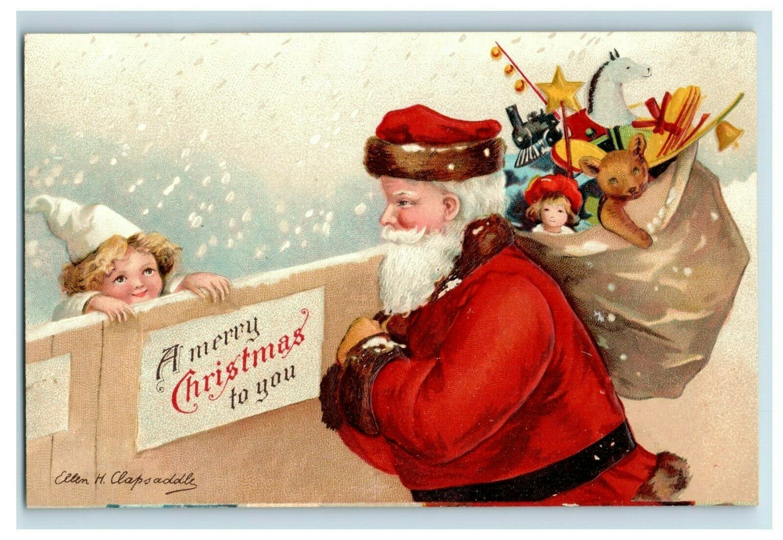 C.1910 Christmas Clapsaddle Santa Bag Of Toys Teddy Cute Girl Snow Postcard P78