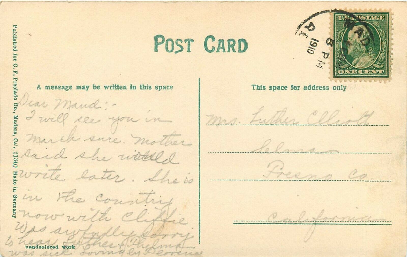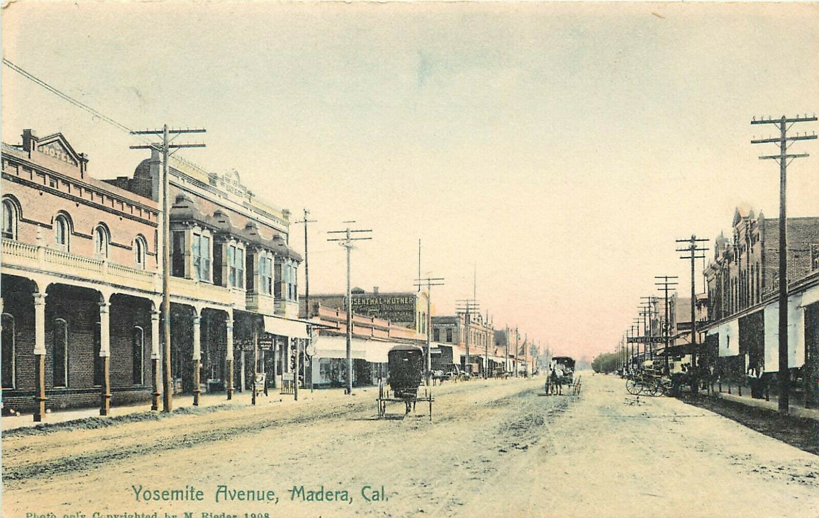 c1910 Hand-Colored Postcard; Yosemite Ave Madera CA Street Scene Posted