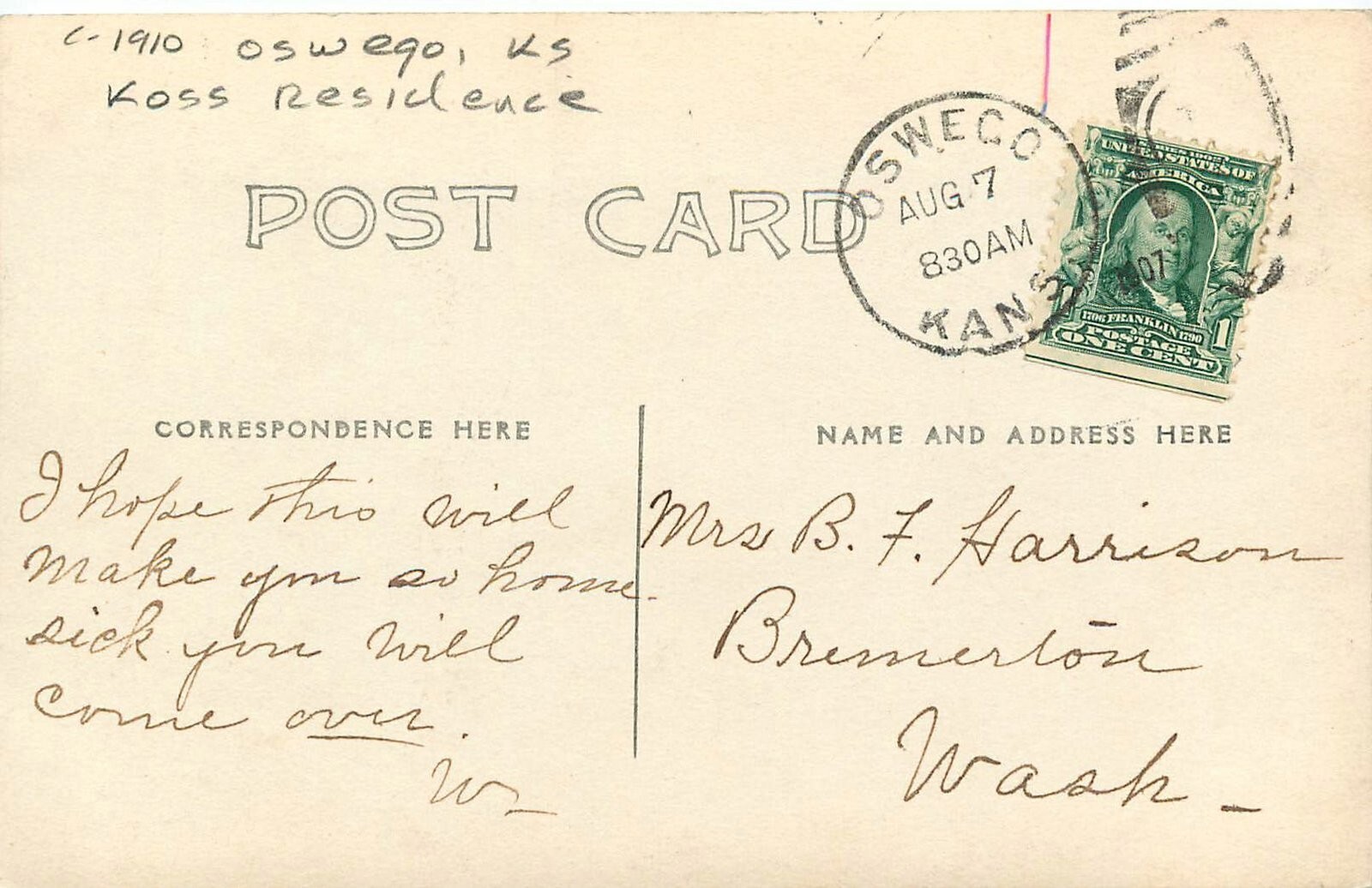 c1910 Oswego Kansas Koss Residence RPPC Postcard 25-11575