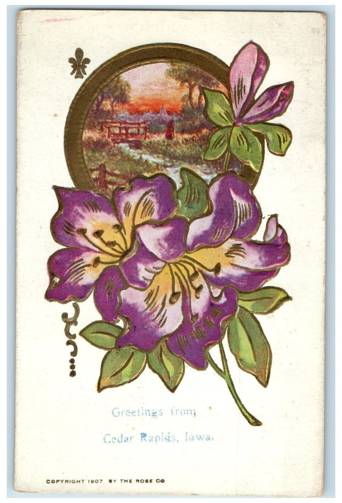 c1910 Purple Flower Greetings from Cedar Rapids Iowa IA Embossed Postcard