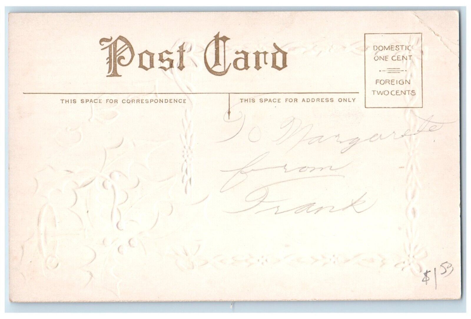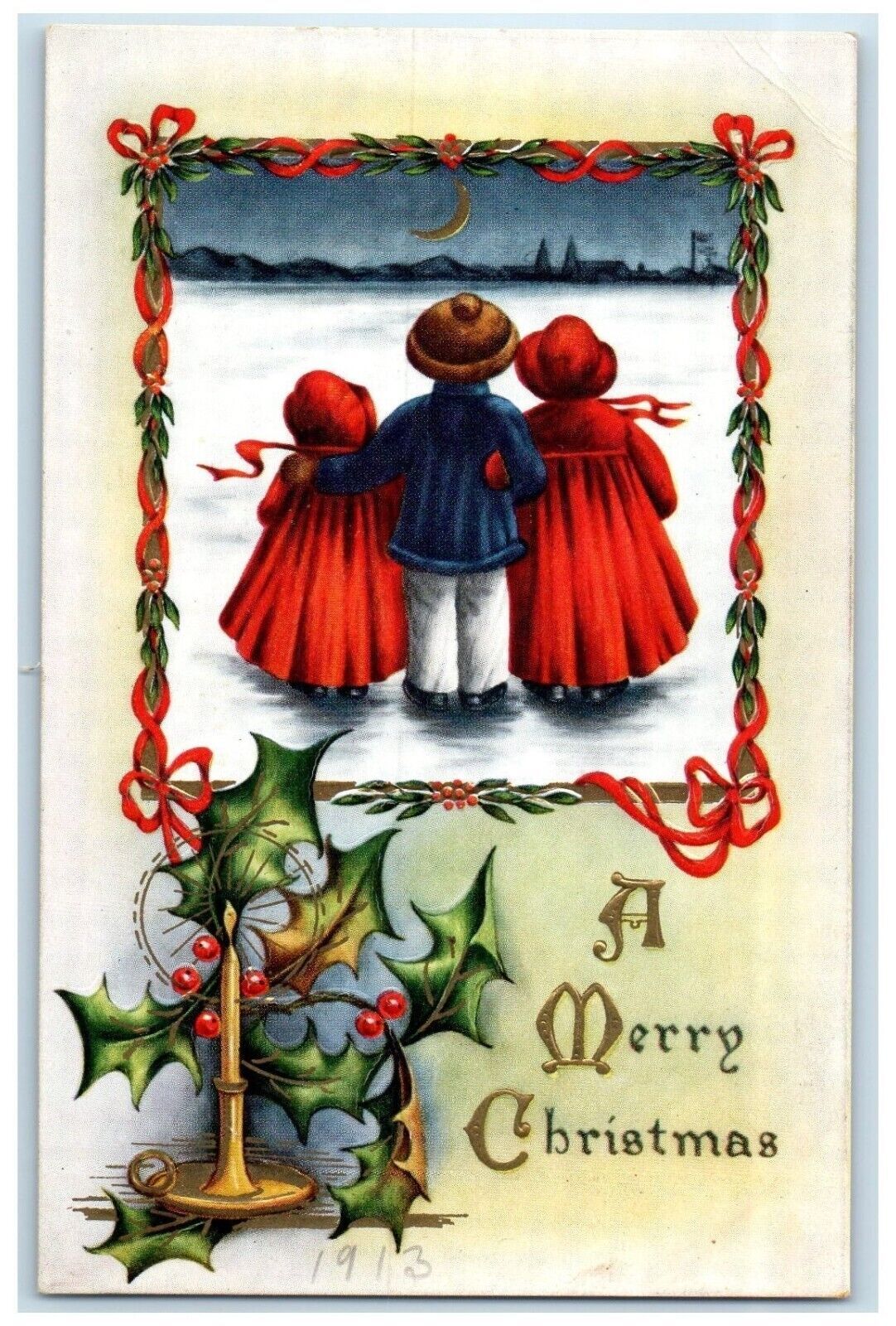 c1910's Christmas Children Crescent Moon Winter Holly Berries Embossed Postcard