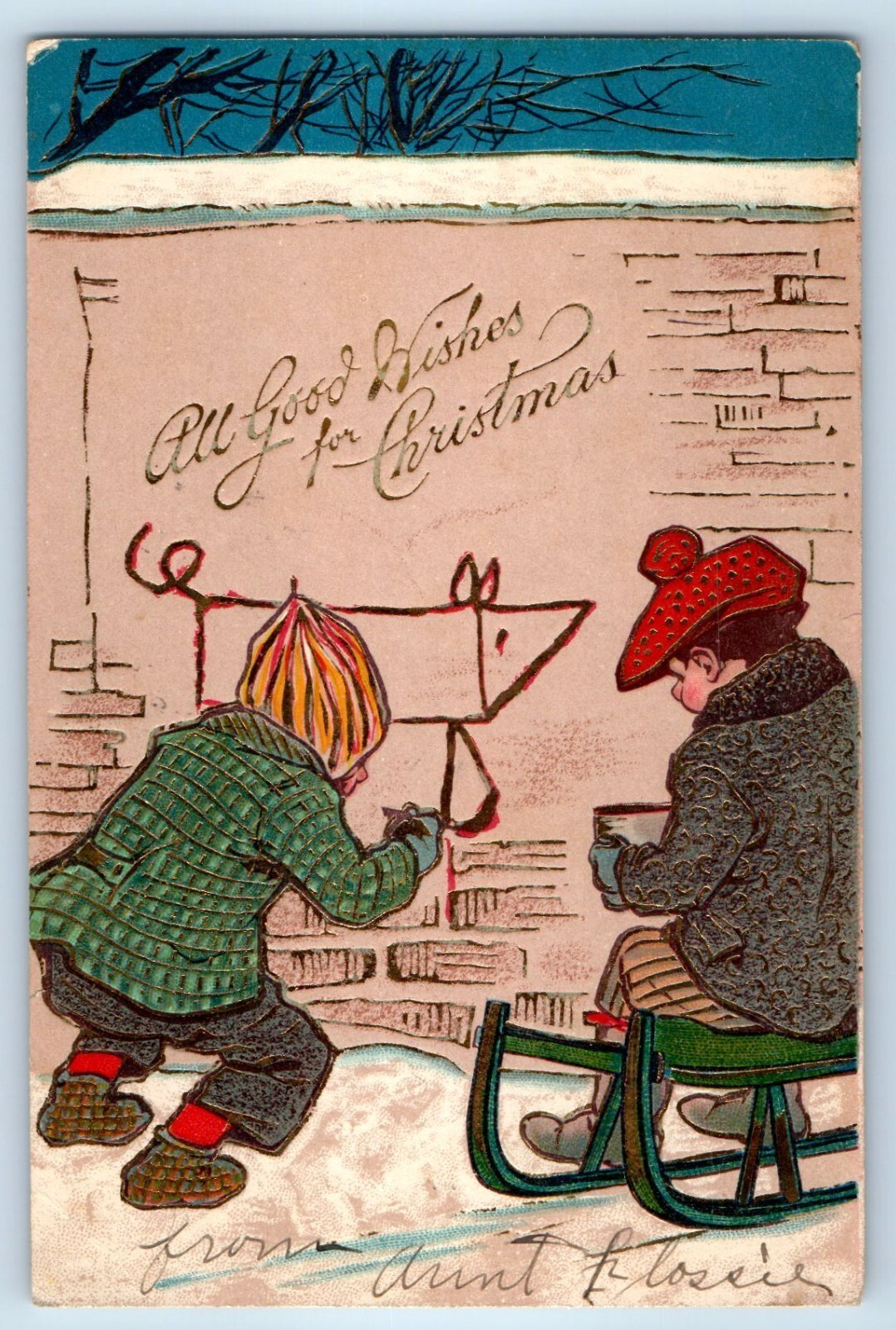 c1910's Christmas Children Drawing Sled Winter Scene Embossed PFB Postcard