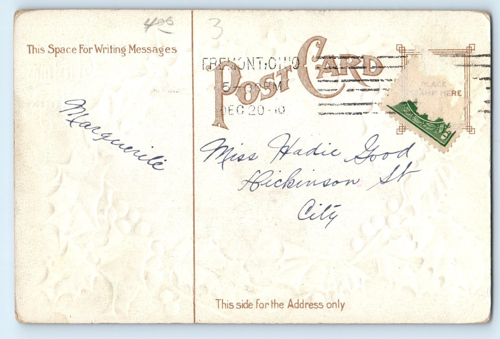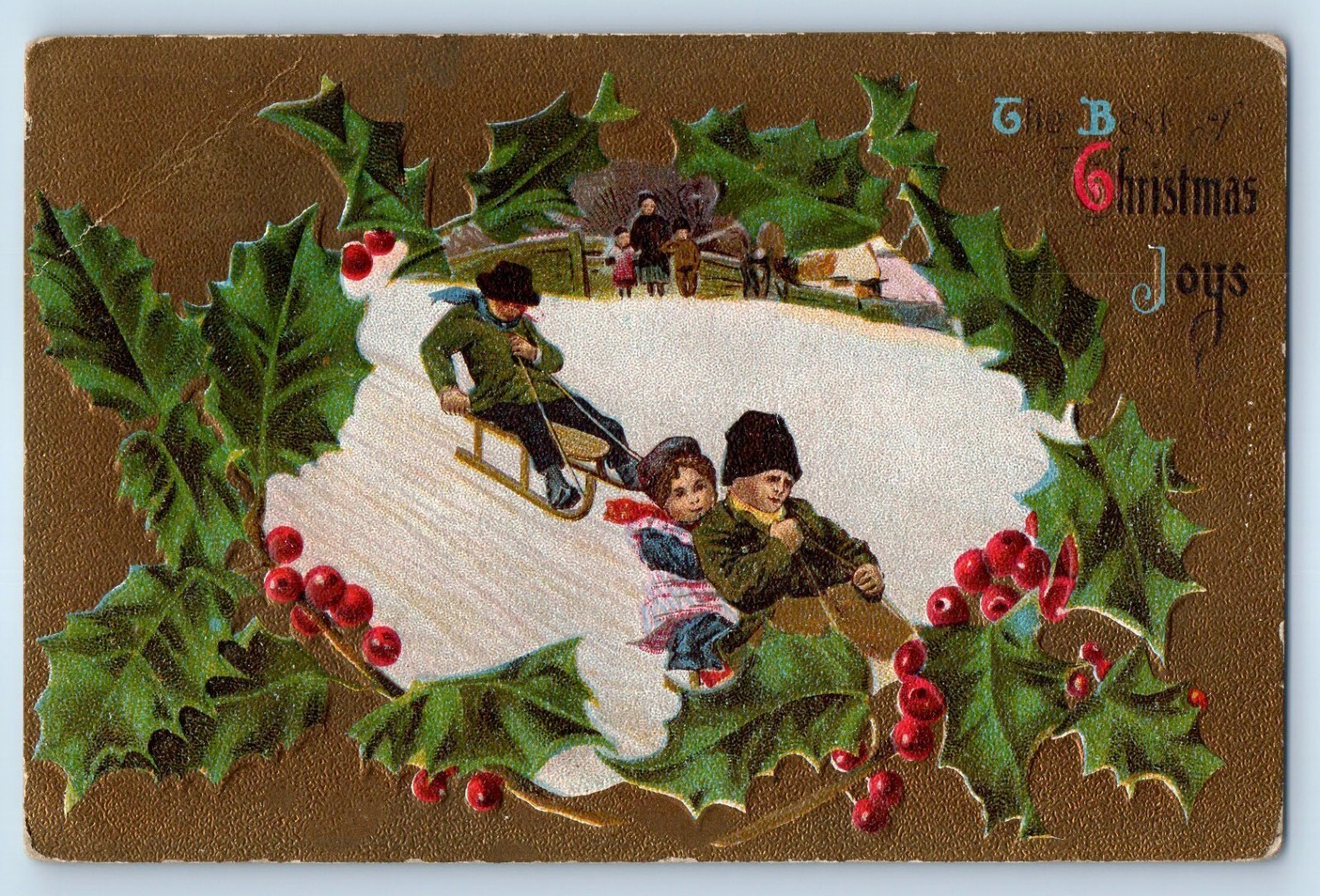 c1910's Christmas Children Sledding Winter Scene Holly Berries Embossed Postcard