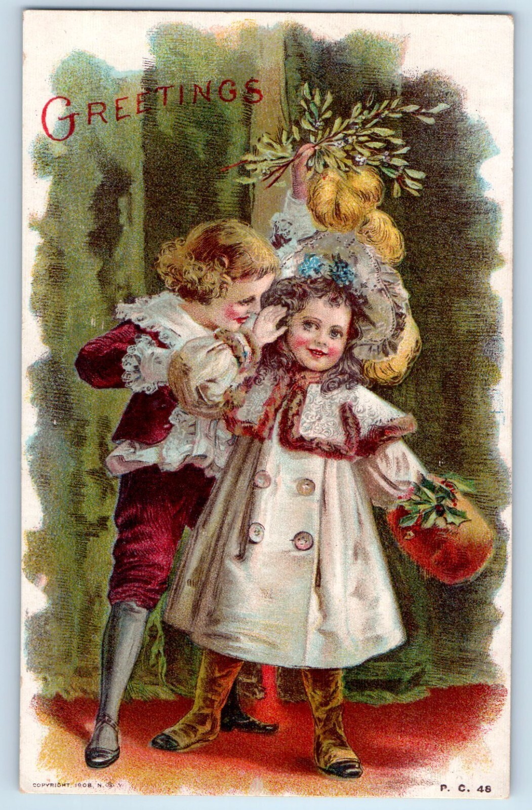 c1910's Greetings Children With Mistletoe Handwarmer Berries Antique Postcard