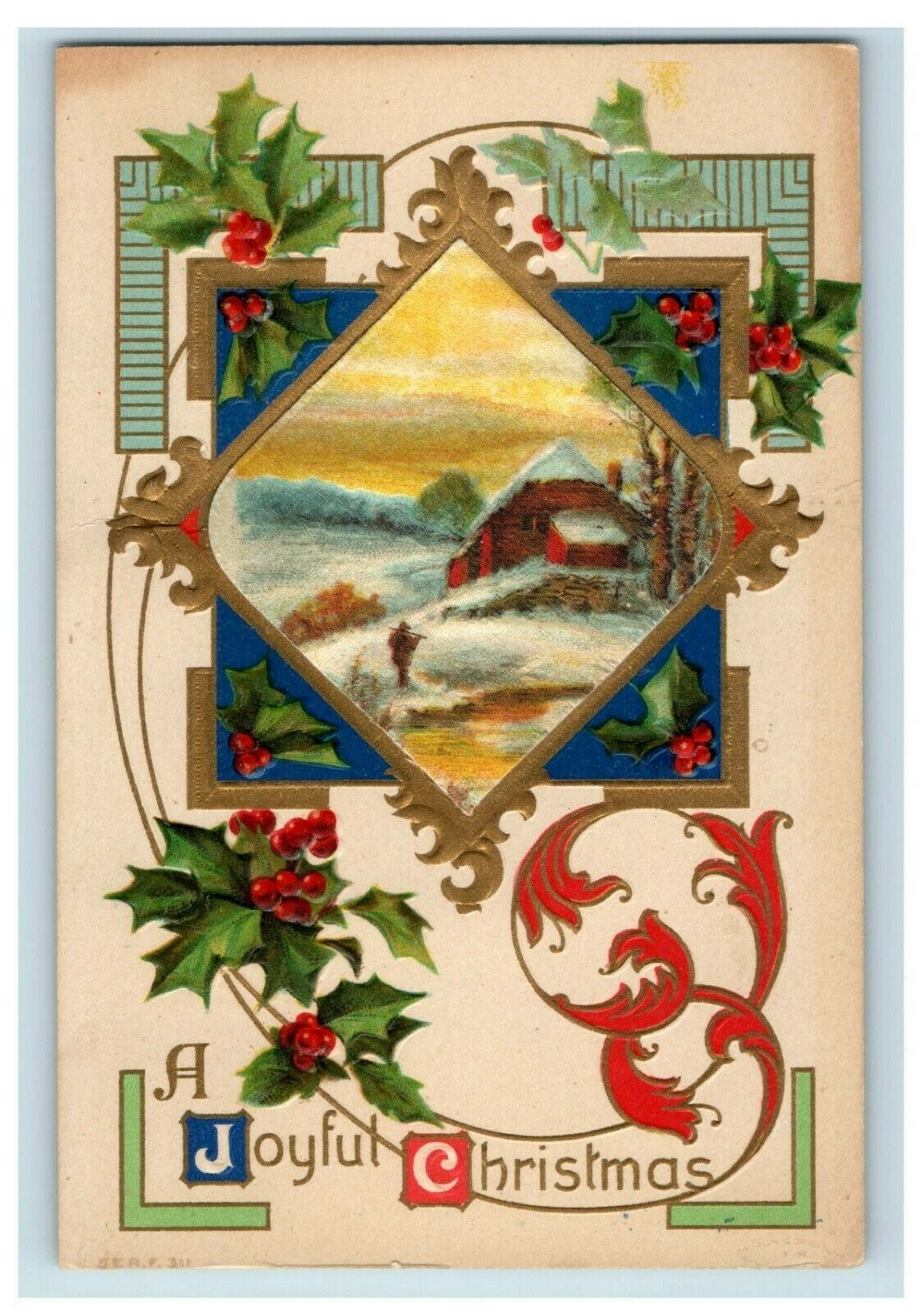c.1910s Joyful Christmas Graphical Holly Berries Snow Postcard F74