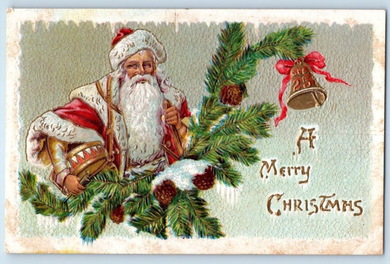 c1910's Merry Christmas Santa Claus Pinecone Ringing Bell Embossed Postcard