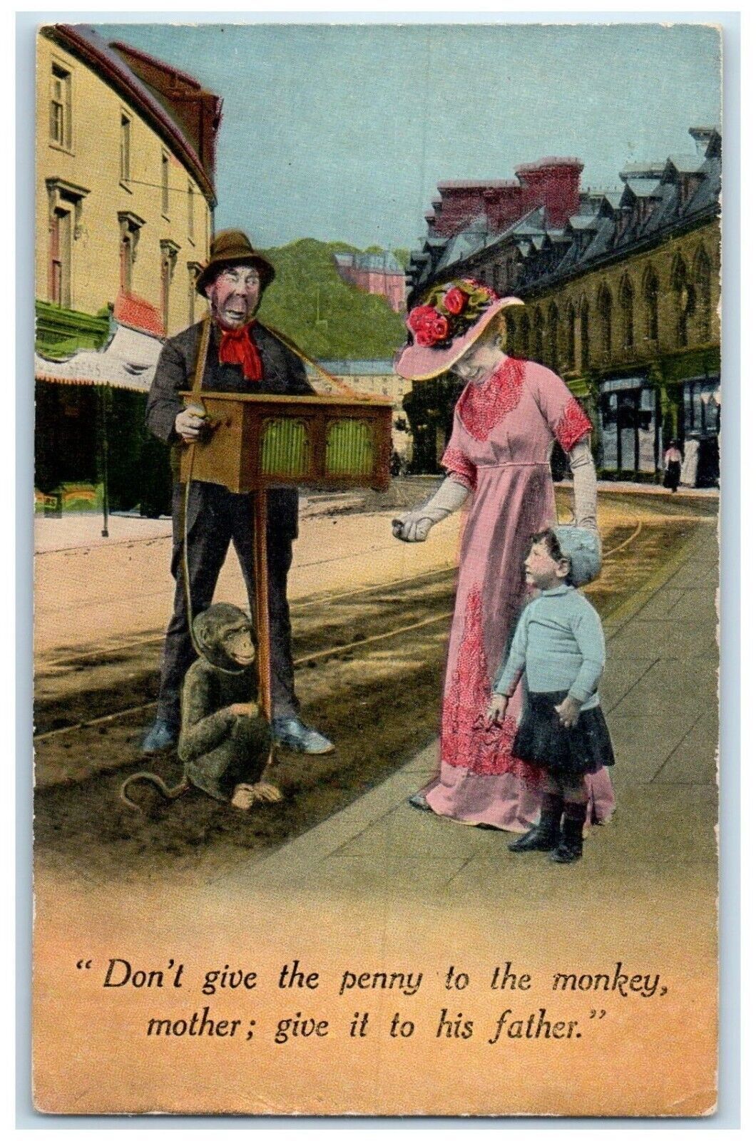 c1910's Mother And Son Don't Give Penny To The Monkey Bamforth Antique Postcard