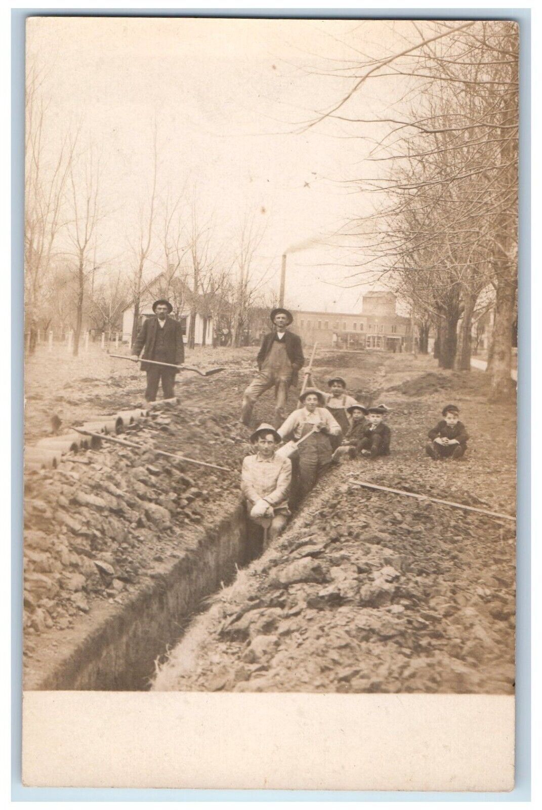 c1910's Pipe Laying Workers Children Boys Tools Occupational RPPC Photo Postcard