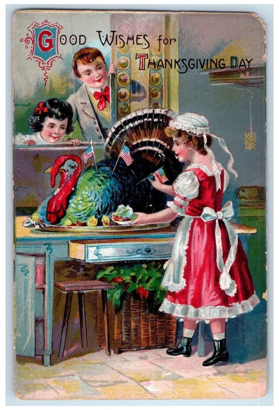 c1910's Thanksgiving Day Chef Designed Turkey Flag Embossed Antique Postcard