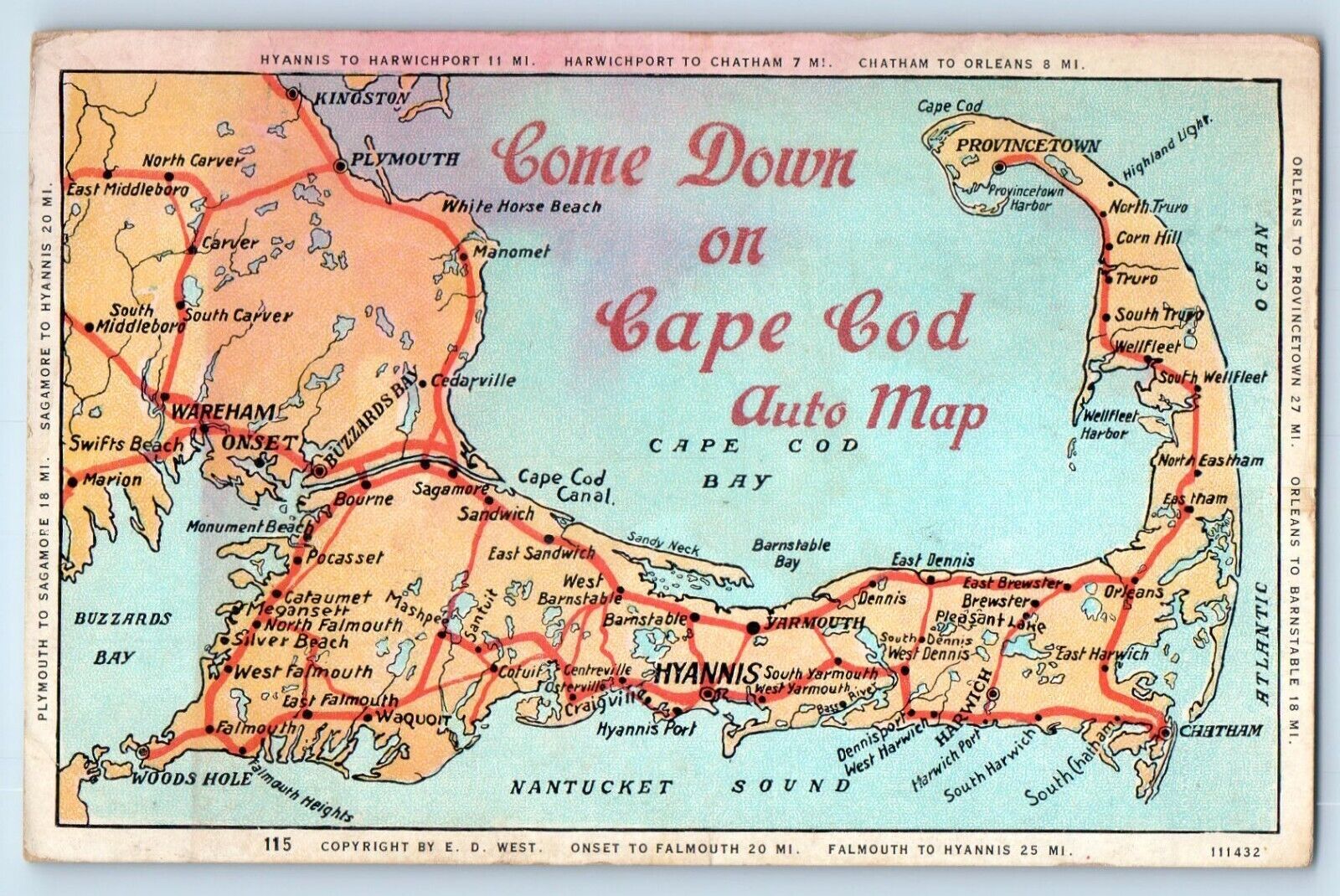 c1930 Massachusetts MA Postcard Came Down Cape Cod Auto Map Bay Nantucket Sound