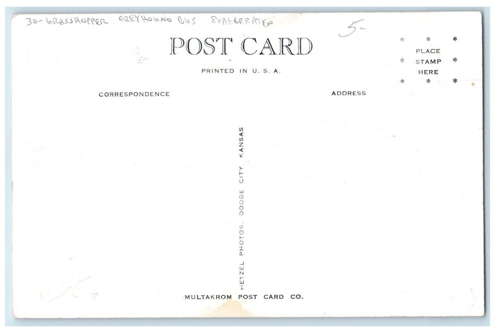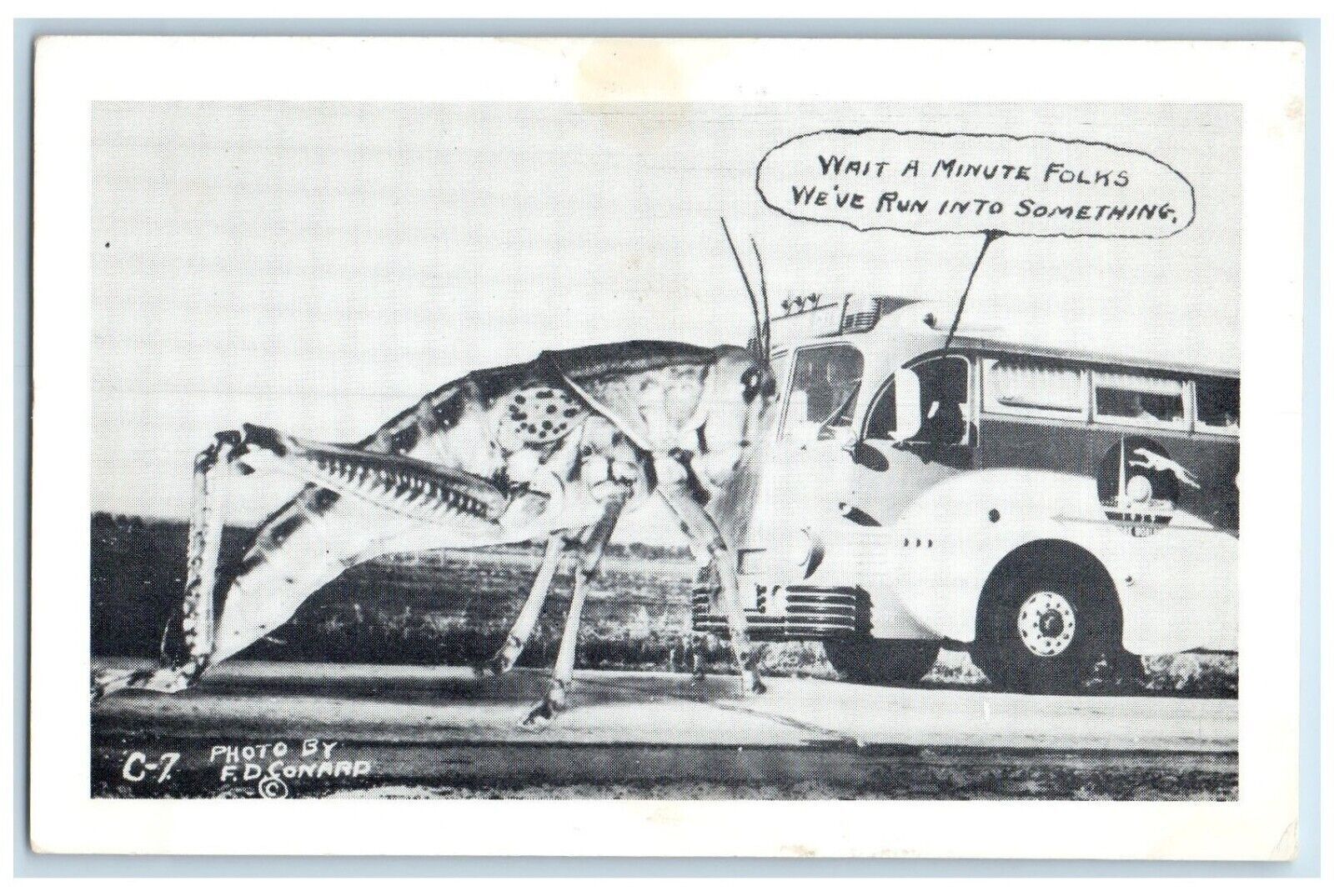 c1930's Grasshopper Greyhound Bus Exaggerated We've Run Into Something Postcard