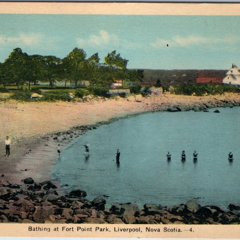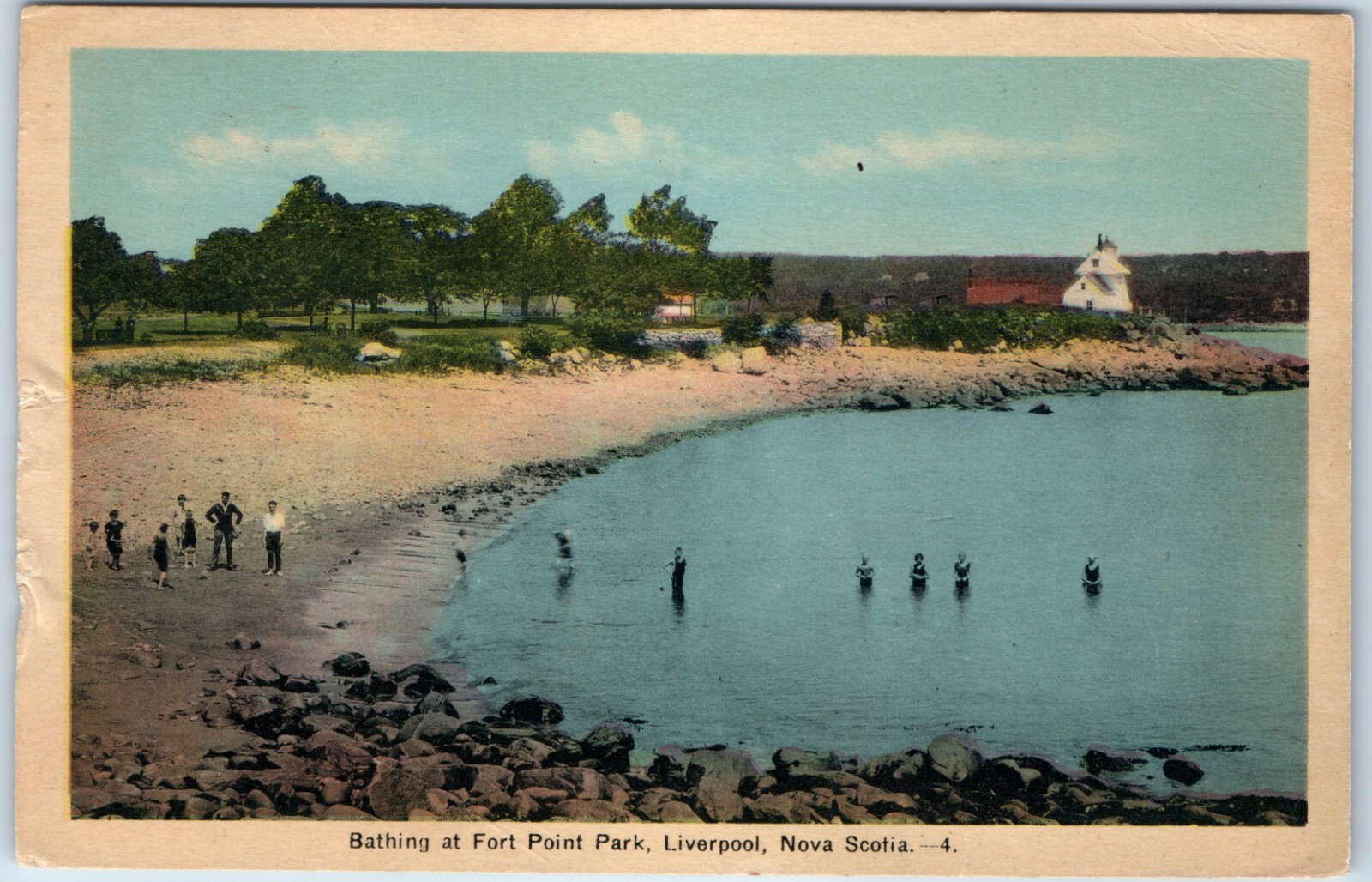 Condition: Posted. See scans for details... May contain flaws not visible in scans. For sale is a vintage white border color lithograph postcard featuring bathers at the beach in Fort Point Park, Liverpool, Nova S ... Read More