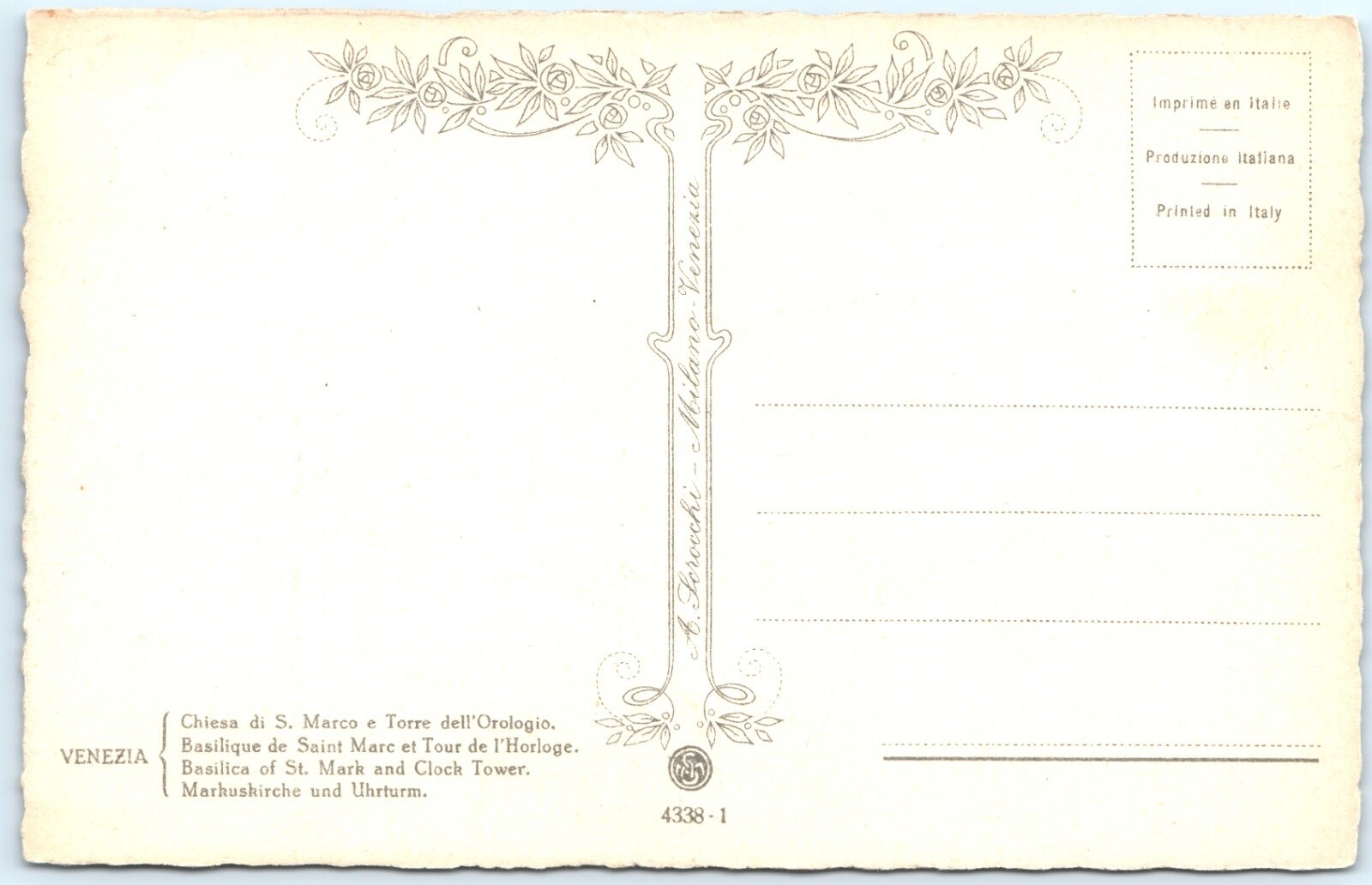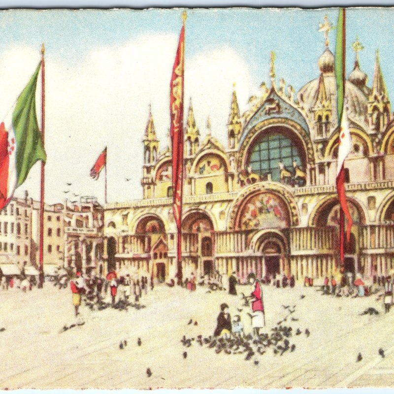 c1930s Venice, Italy Postcard St Mark Basilica Clock Tower Square Pigeons A375