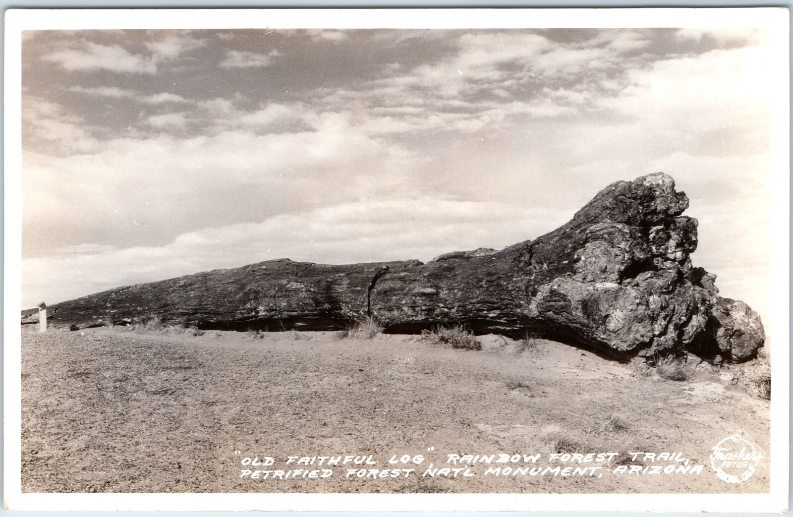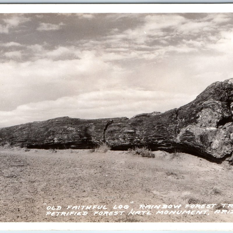 c1940s Petrified Forest, AZ Rainbow Forest Trail Old Faithful Log Postcard A29