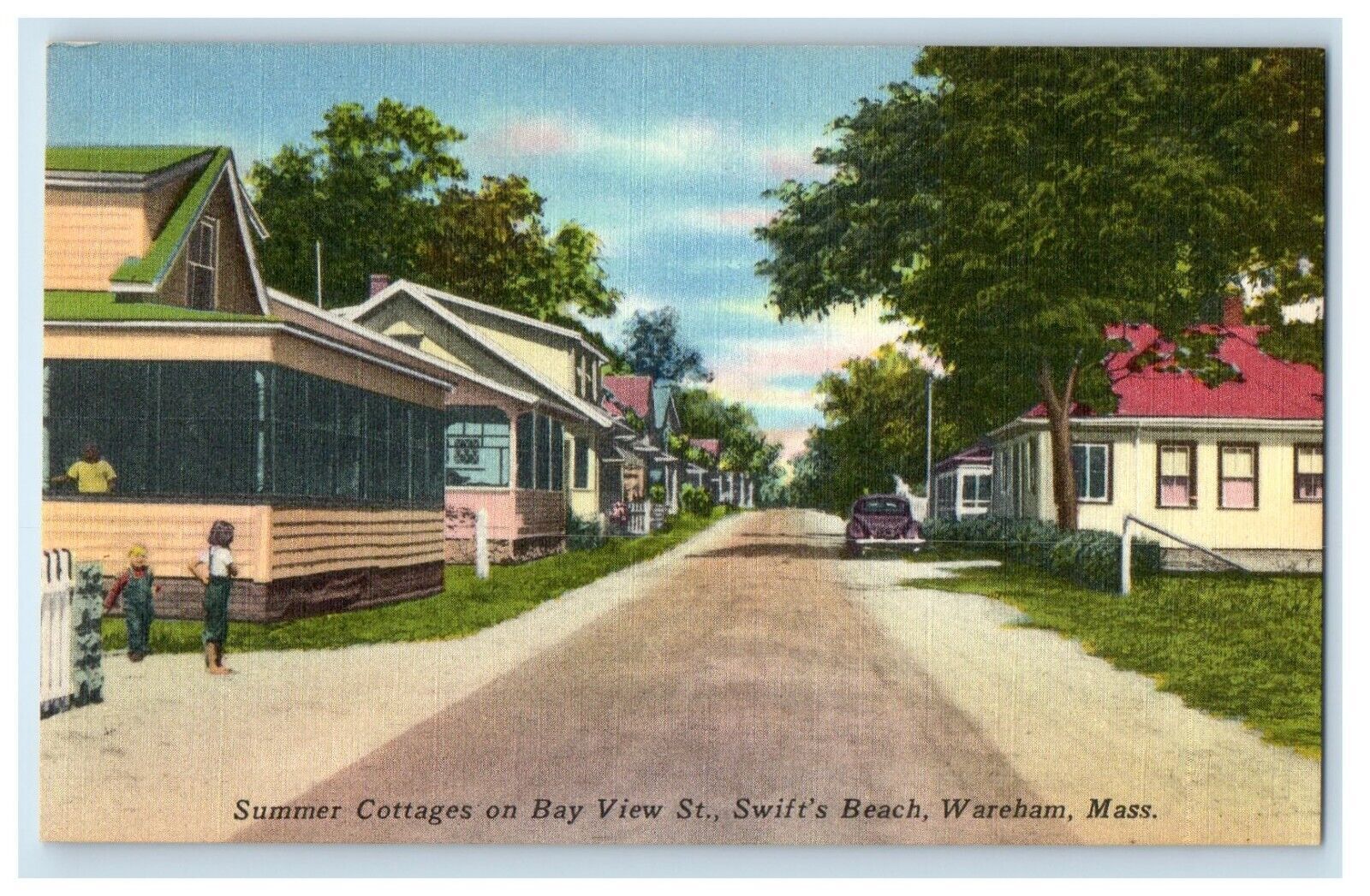 c1940's Wareham MA, Summer Cottages Bay View St. Swift Beach Car Postcard