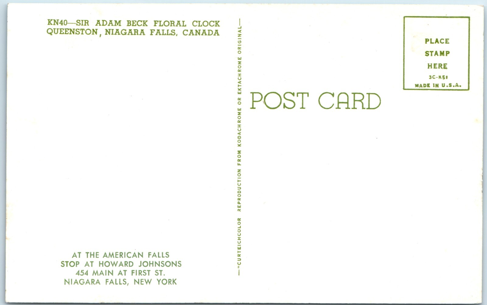 For sale is a vintage Curteichcolor chrome postcard featuring the Sir Adam Beck Floral Clock in Queenston, near Niagara Falls, Canada. The image captures the massive floral timepiece with a vintage automobile visible in the background, highlighting the 1950s era. The back contains an advertisement for Howard Johnson's Restaurant at the American Falls, Niagara Falls, New York. The code 3C-K51 indicates a 1953 printing date. Unposted.View all photos for details on condition. If you have any questions or need to verify condition, message me. Date is approximate.Shipped FAST and Safe!To order multiple items with combined shipping, send me an offer for each item. When I accept them, I will update the shipping costs before you pay. If you overpay, remind me and I will refund you the difference.See my feedback to purchase with confidence!Please contact me with any issues prior to leaving negative/neutral Feedback or low detail ratings, as I will always do my best to solve any problems that may come up!We are a small family-based business and we value every single sale.See my Store / Other Listings for more!