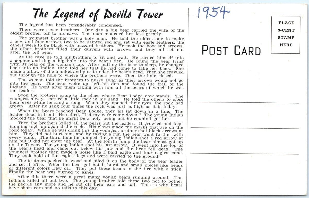 c1954 Devils Tower WY Legend Bear Native American Story History Chrome Lg PC M28