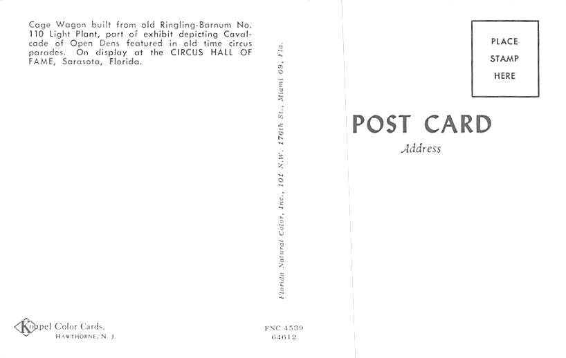 Cage Circus Wagon Circus Wagon World Museum Postcard Unused, Grade: 1, , Size: Regular size: Approx 3 1/2 X 5 1/2 inch (9 cm X 14 cm) Grading Scale: Grade 1 = Perfect corners Grade 2 = Very Minimal corner wear ... Read More