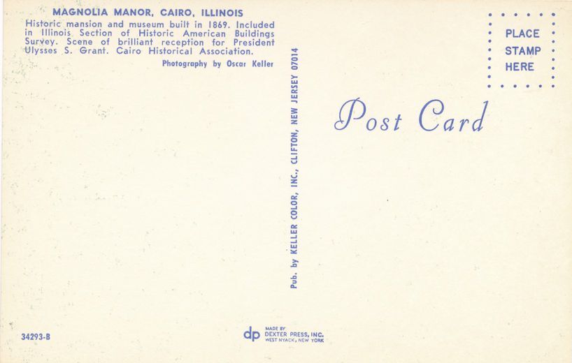 Cairo, Illinois - Magnolia Manor- Mansion. Standard sized chrome card. Made by Dexter Press of West Nyack NY. Good to very good condition.