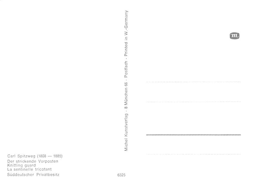 Cal Spitzweg - Knitting Guard Continental Size Postcard, Approx 4 in x 6 in (10 cm x 15.25 cm) Continental Size: 4X6 inches (10.5 cm x 15 cm)