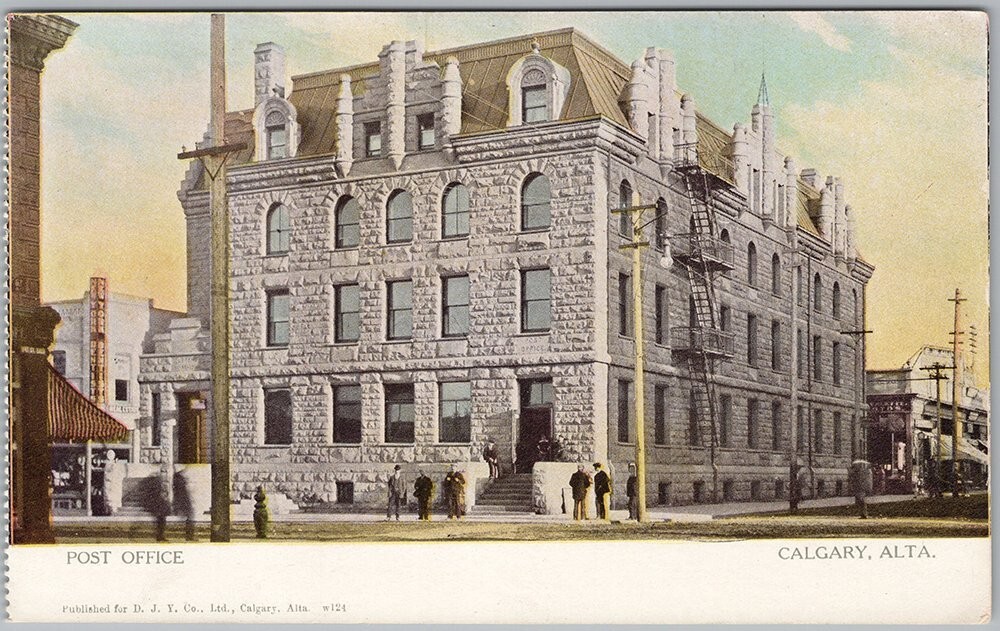 Step back in time with this captivating vintage postcard featuring the historic Post Office in Calgary, Alberta, Canada. The detailed image showcases the impressive stone architecture of the building, complete with ornate rooflines, arched windows, and a grand entrance. Figures of people are visible outside, adding a sense of scale and daily life to this early 20th-century street scene. This collectible piece offers a glimpse into Calgary's past, highlighting a significant civic landmark and the bustling atmosphere of its early development. The card's aesthetic is typical of its era, presenting a charming hand-colored or tinted appearance that enhances the architectural grandeur.This Canadian souvenir postcard, identified by the number W124, was published for D. J. Y. Co., Ltd. of Calgary, Alberta, and printed by the renowned Warwick Bro's & Rutter, Limited, Printers of Toronto. Its divided back design indicates a production period from the early 1900s, making it a valuable historical artifact for enthusiasts of Canadian history, architecture, and vintage ephemera. The detailed printing captures the essence of early 20th-century urban landscapes and the importance of public buildings like the Post Office as community hubs. This postcard is a perfect addition for collectors seeking rare views of Western Canada or specific architectural subjects.Please zoom into and look closely at the front and back photos to view condition and feel free to send me a message if you have any questions. Thanks kindly for viewing, D