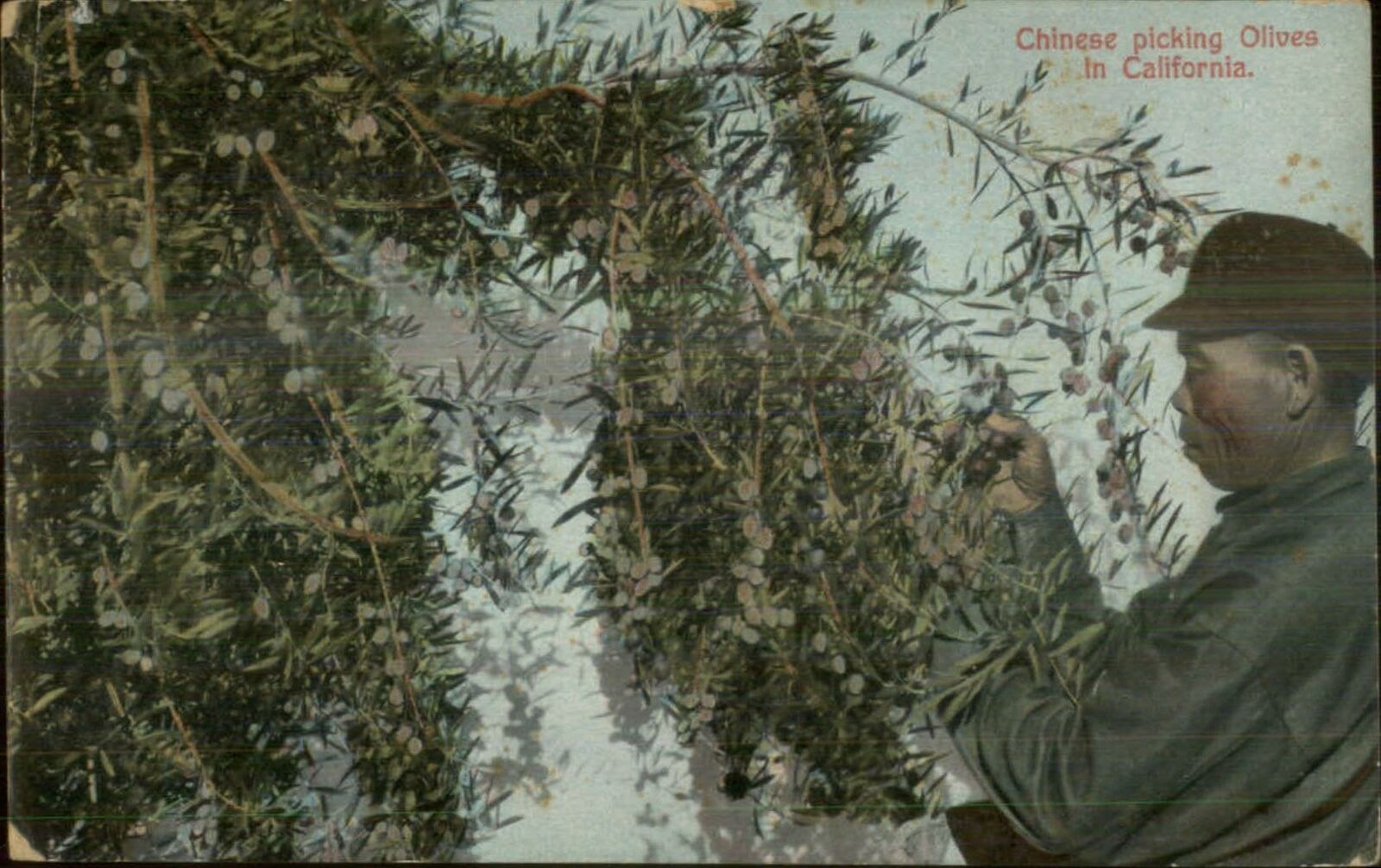 California Olive Farming Chinese Labor Man Picks Olives c1910 Postcard