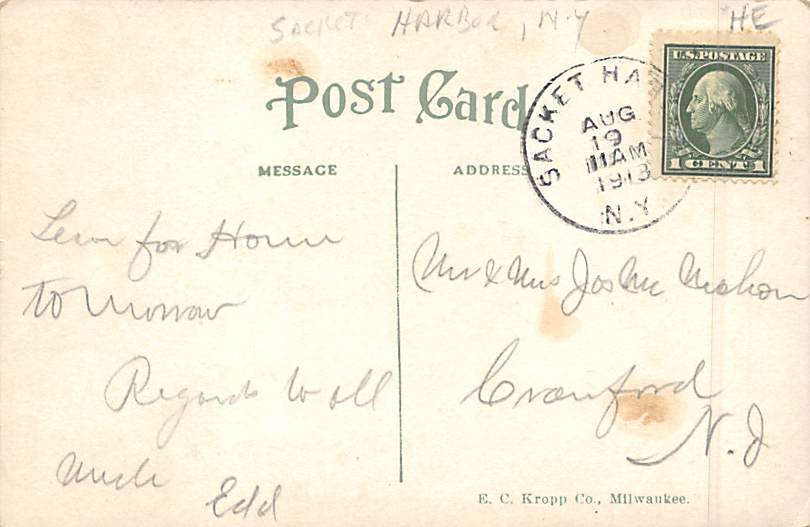 Camp Manor House Sackets Harbor, New York NY Postcards - 1913 Grade: 3 stains on back Size: R - Regular Size Postcard - approximately 3 1/2 inch x 5 1/2 inch (9 CM x 14 CM) Grading Scale: Grade 1 = Perfect corn ... Read More